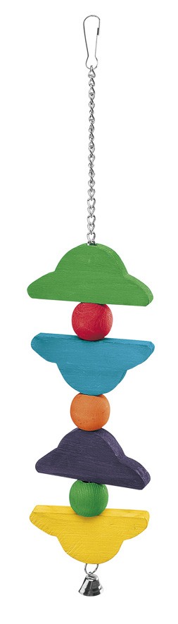 Farebná kovovo-drevená závesná hračka pre papagáje.